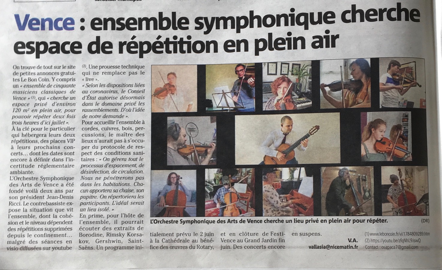 Le 27 mai , Nice-Mâtin à publié notre appel en vue de la recherche d’un terrain privé prêté pour répétitons.
